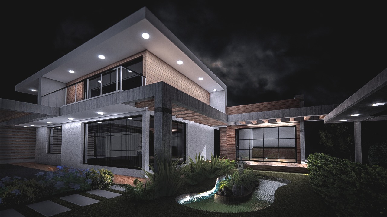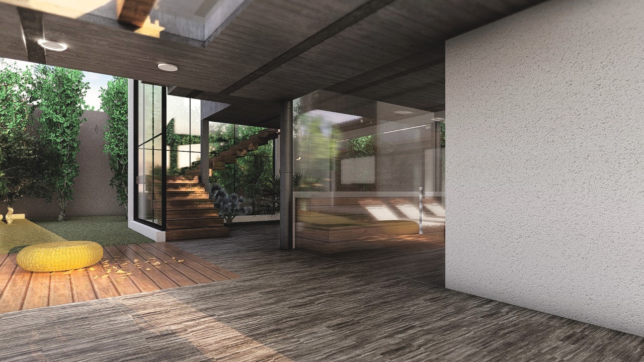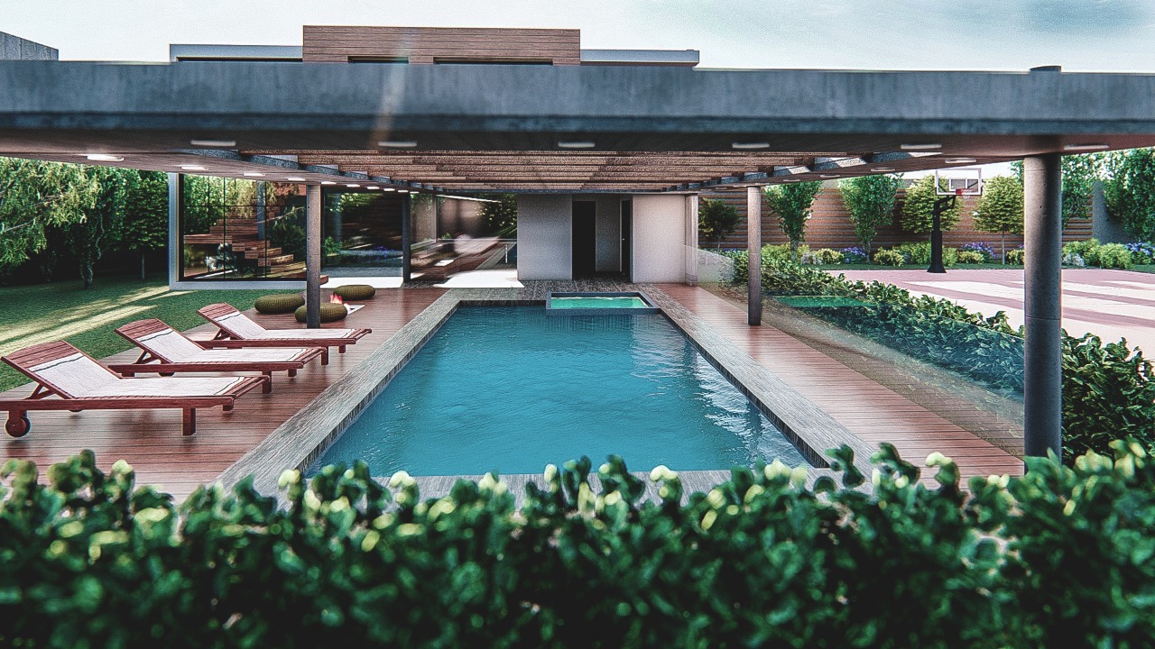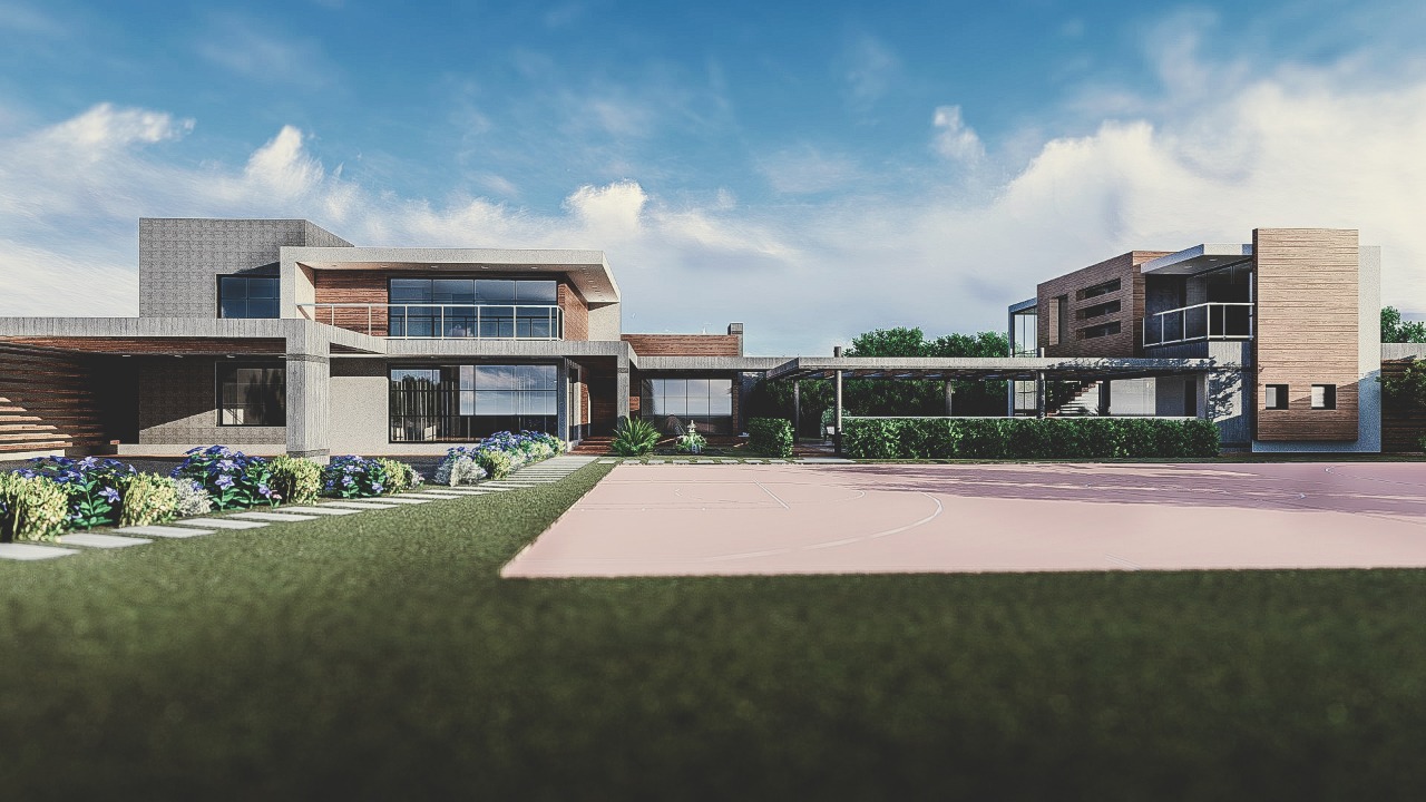 También se propuso una suite independiente para uso de los invitados de 120m2 distribuida en 1 planta y cuenta con Sala, Comedor, Cocina, Cuarto de lavado, Bodega, Baño social y 1 Dormitorio con baño privado. En la parte exterior se propuso un espacio familiar que consta de sauna, hidromasaje, minibar y gimnasio y la piscina cubierta de 32 m2.