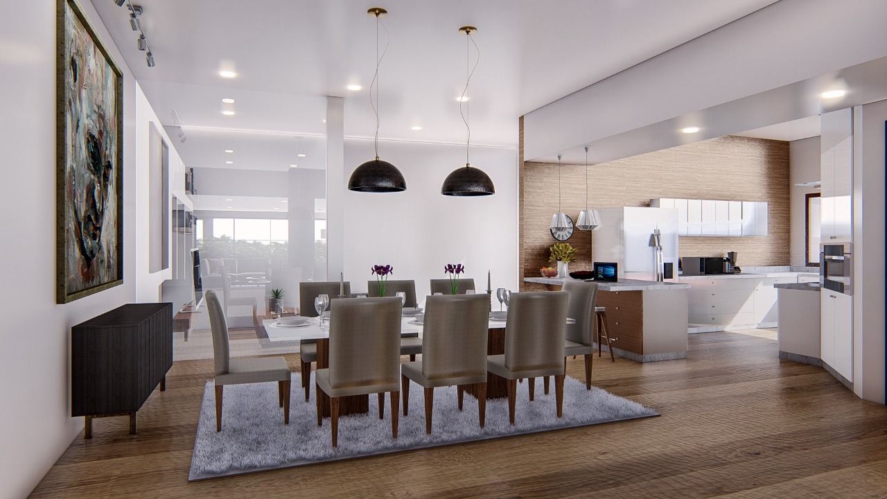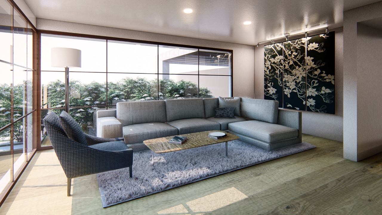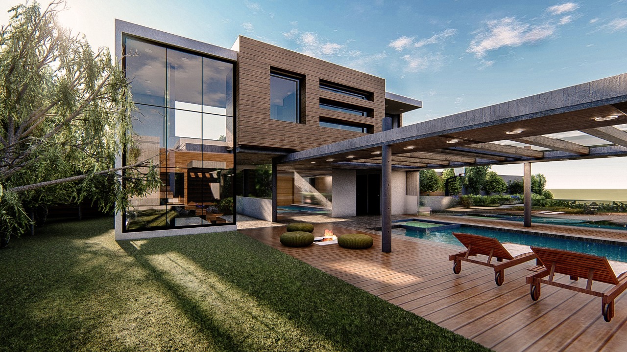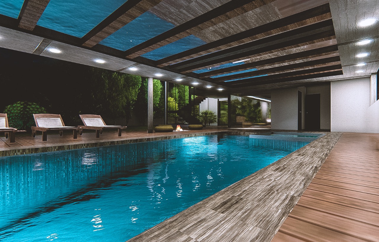 También se propuso una suite independiente para uso de los invitados de 120m2 distribuida en 1 planta y cuenta con Sala, Comedor, Cocina, Cuarto de lavado, Bodega, Baño social y 1 Dormitorio con baño privado. En la parte exterior se propuso un espacio familiar que consta de sauna, hidromasaje, minibar y gimnasio y la piscina cubierta de 32 m2.